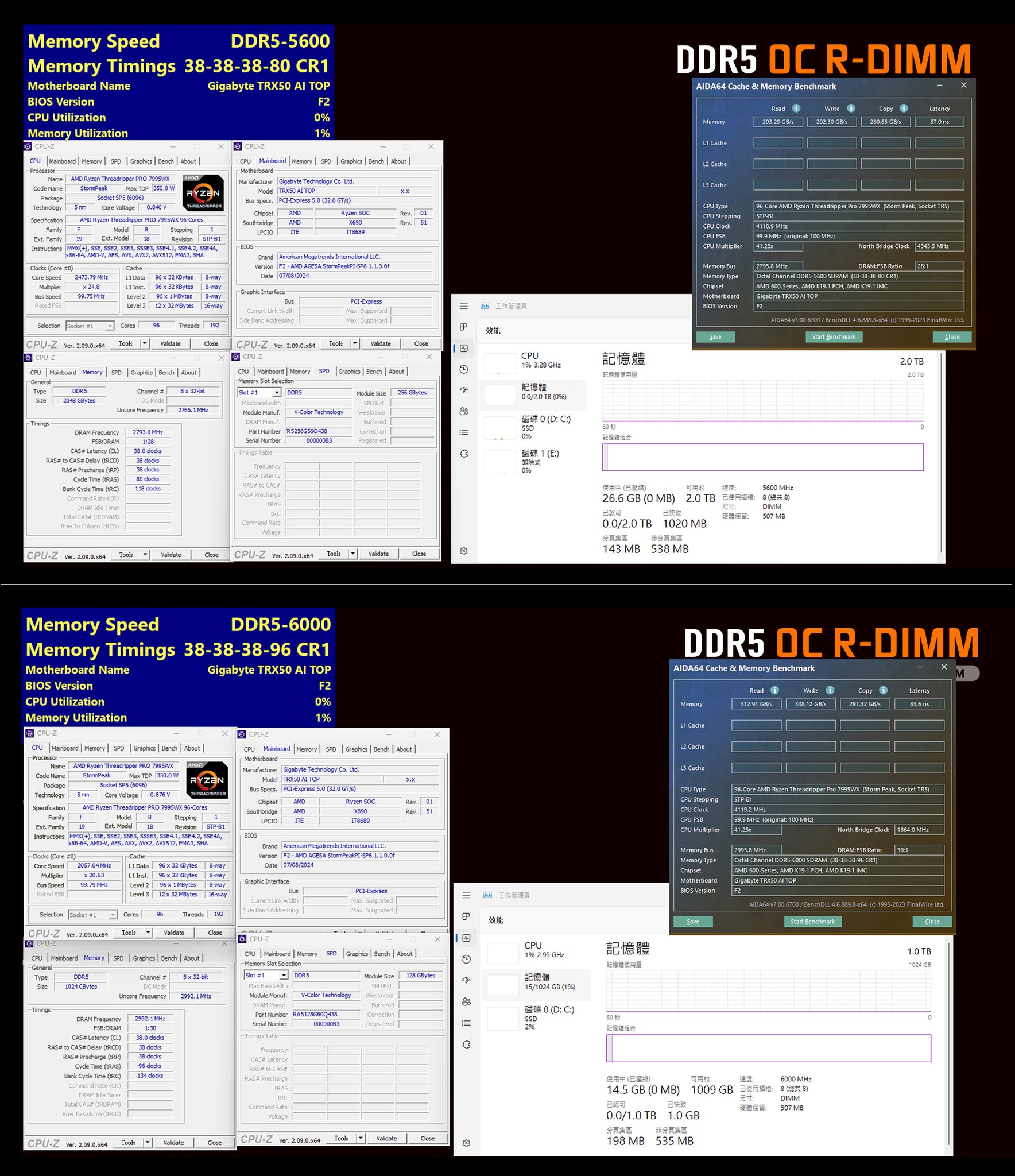 1 月 13 日 信息,台湾地域存储模组品牌全何 V-Color 本月 9 日 宣告面向高性能工作站 / HEDT 推出系列大容量超频 DDR5 RDIMM(注:即俗称的 RECC 内存条)产品,在业界领先将超频 RDIMM 的单条容量 扩充到 256GB 。 ![]() 因为 RDIMM 设计和大容量的双重 制约,全何的此批产品在绝对参数方面远不如常见的 UDIMM 超频内存条(传输速率至高可达 6000MT/s,时序低至 CL38),但仍能在内存密集型工作负载中 展示远优于 JEDEC 标准内存的 效劳 。 全何 示意其大容量超频 RDIMM 内存条专为英特尔 W790、AMD TRX50 主板平台而设计,提供了 4×128GB、8×128GB、4×256GB、8×256GB 四种容量组合,套条总容量可达 2TB 。 ![]() 这些内存条已在技嘉 AI TOP 系列主板上进行了测试验证,具体 成就如下: