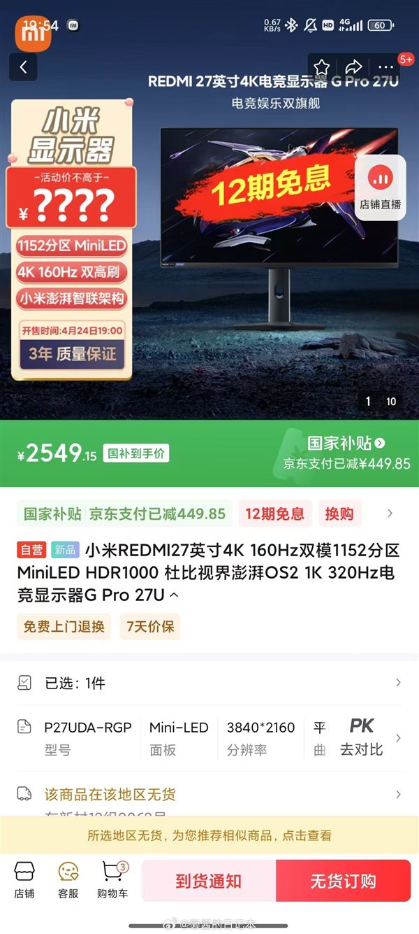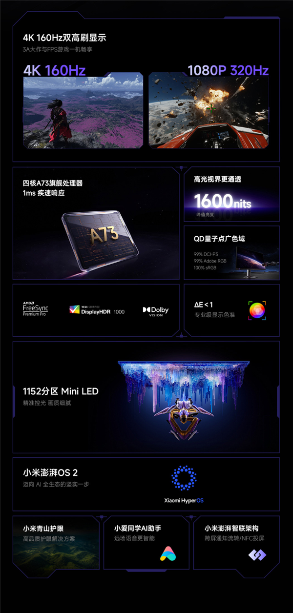 4月17日 信息,今天,小米官方 宣告,REDMI显示器G Pro 27U开启预售,将于4月24日19:00正式开售 。 显示器当前在小米商城的价格为9999元,固然这只不过 虚构价格占位 。 ![]() 昨晚,REDMI显示器G Pro 27U在京东偷跑后又下架,依据博主“懒酱的日记本”晒出的截图显示,该显示器原价2999元,国补后2549元 。 ![]() ![]() ![]() G Pro 27U是小米旗下首款显示器/电视双 状态产品,搭载小米 汹涌OS 2, 使用遥控器可一键秒变电视 。 ![]() 据了解,G Pro 27U采纳27英寸Mini LED屏幕,分辩率为3840*2160、1152分区,采纳自研LocalDimming算法配合Al智能场景 鉴别,动态优化背光操纵策略 。 屏幕 占有1600nits峰值亮度,通过DisplayHDR 1000认证,动态对照度1000000:1, 支撑99%?DCI-P3、99%?Adobe RGB、100%?sRGB广色域 遮蔽、10bit色深、10.7亿专业色数、色准ΔE<1, 支撑小米青山护眼 。 此外,G Pro 27U还 支撑4K 160 Hz和1080P 320Hz双高刷显示,玩3A大作或FPS游戏一台显示器就能搞定 。 核心配置上,G Pro 27U搭载MT9655四核A73 解决器,3GB+32GB存储组合,装备双5W立体声扬声器, 支撑Wi-Fi 6、蓝牙5.2, 支撑小爱同学、联动智能家居 。 提供2*HDMI 2.1、1*DP 1.4、1*USB 3.0、1*3.5mm接口 。 ![]() ![]() |