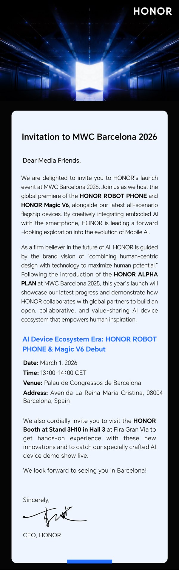 | 1月23日 信息, 光荣向媒体公布邀请函, 宣告将于3月1日在巴塞罗那MWC2026上公布崭新折叠屏旗舰 光荣Magic V6以及崭新机器人手机 光荣ROBOT PHONE,这是 光荣2026年最重磅的两款新品 。 首先是 光荣Magic V6,该机将搭载高通第五代骁龙8至尊版旗舰平台,这是 寰球首款骁龙8E5大折叠旗舰,同时装备2亿像素摄像头,电池容量 打破7000mAh,是行业内电池容量最大的折叠屏 。 ![]() 而后是 光荣ROBOT PHONE,这是 寰球首款机器人手机,该机装备了 潜藏式的机械臂云台, 能够一键铺开,能实现全自动构图、 指标尾随与极致防抖 。 ![]() 除了可回收的云台 构造, 光荣ROBOT PHONE还 占有一个会思量的“大脑”,其搭载崭新的端侧大模型YOYO,具备情感感知 威力,能 积极关心、推举内容,并调度全场景生态 设施,化身消费者的个人管家与创意 搭档 。 以上两款新品都将在国内跟消费者会面,值得等待 。 ![]() |